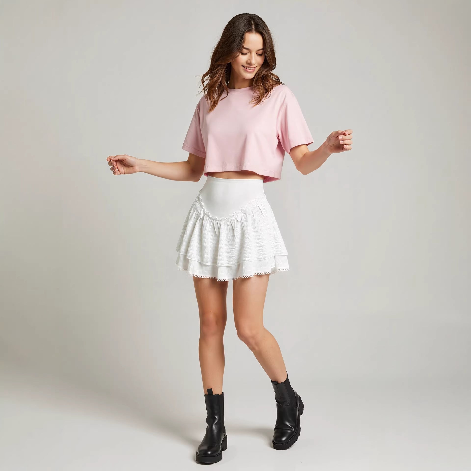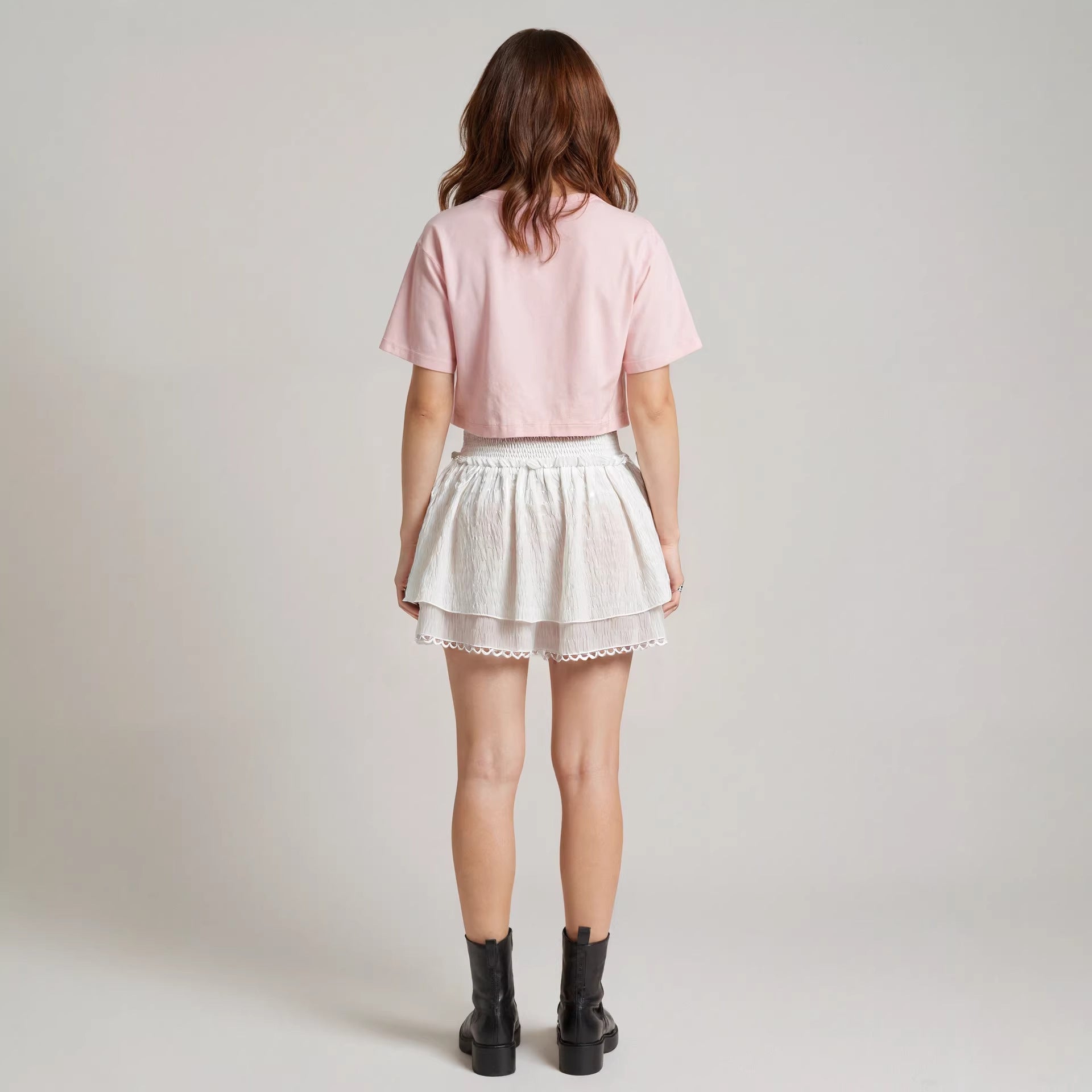 Deze minimalistische rok combineert een verfijnde pasvorm met zacht vallende stof. De lichte structuur benadrukt de vrouwelijke silhouet zonder te overheersen. Het delicate kantdetail voegt subtiele elegantie toe.