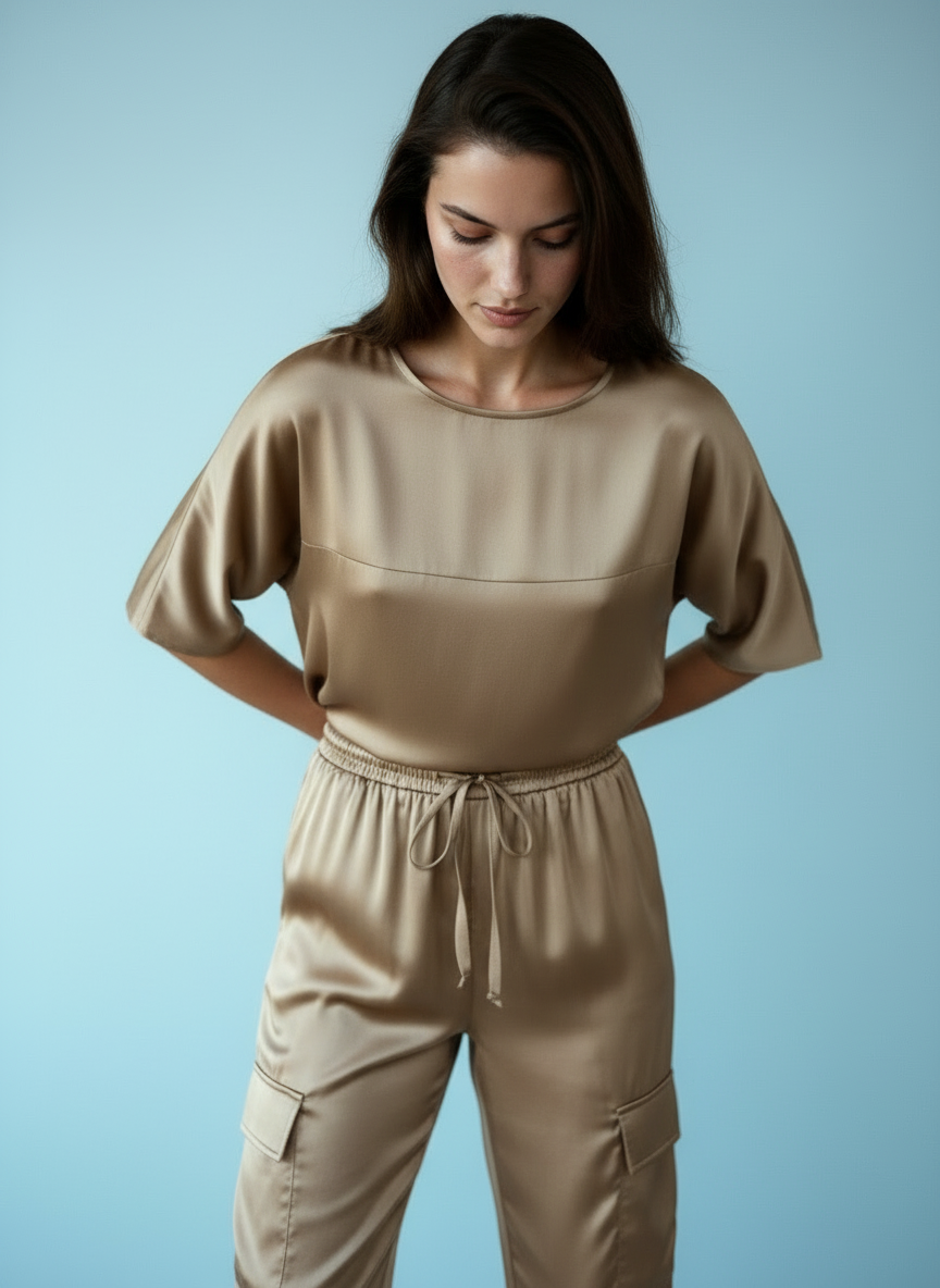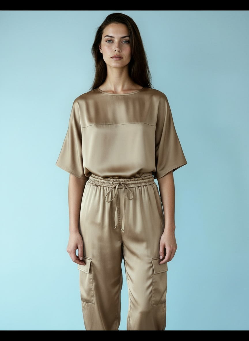 Deze tweedelige set omhult het lichaam met een zachte, luxe satijnen stof. De ontspannen pasvorm combineert comfort met een verfijnde uitstraling. Een subtiele glans benadrukt de elegante en minimalistische snit.