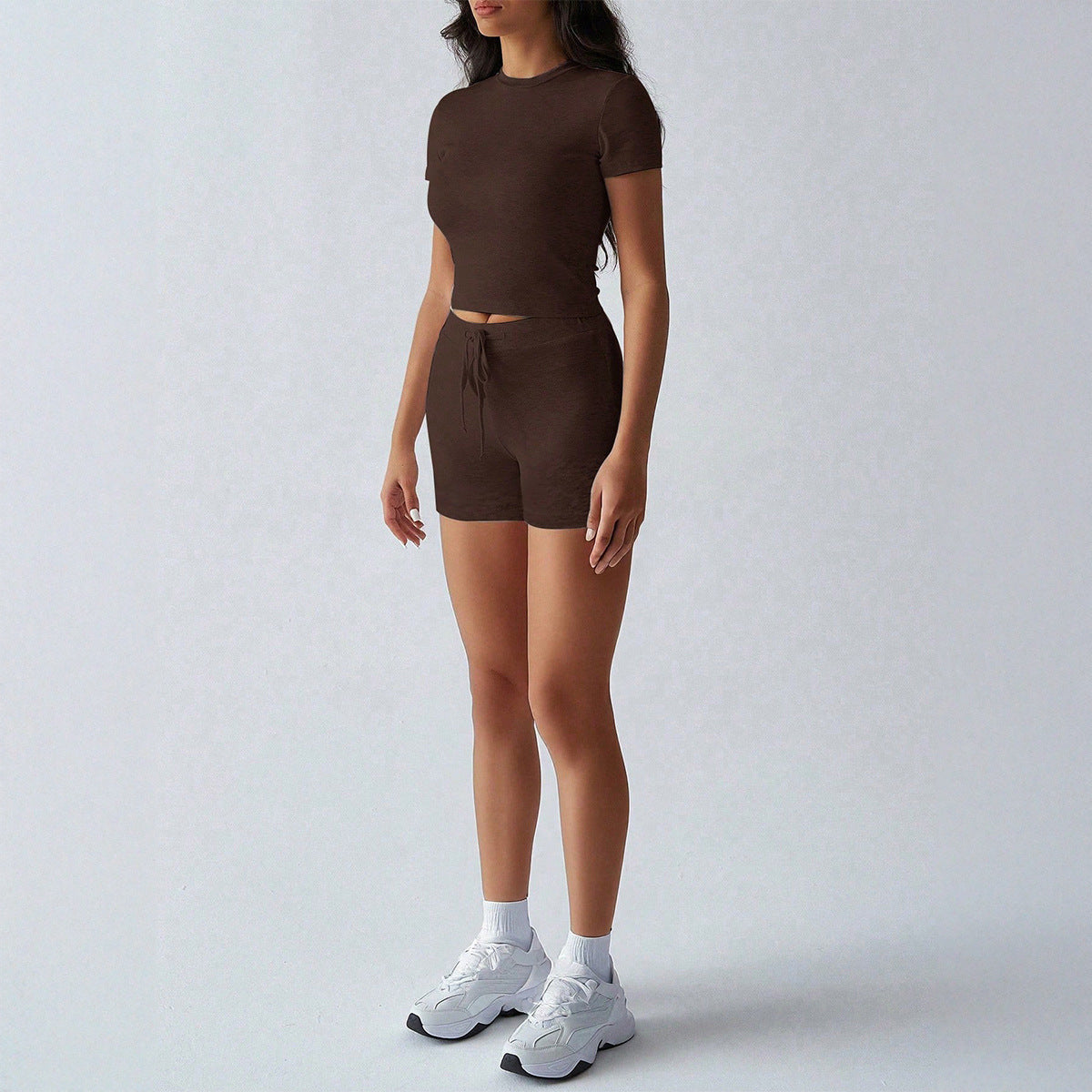 Yoga Active Wear effen kleur korte mouwen trekkoord shorts set