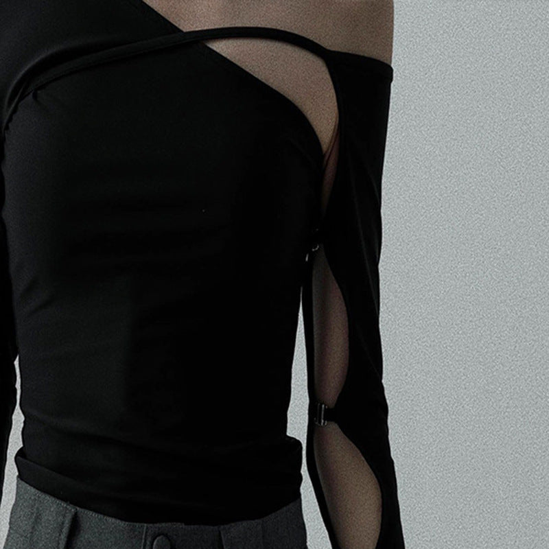 Deze minimalistische top sluit nauw aan op het lichaam en volgt de natuurlijke vormen. Het zachte, dichtgebreide materiaal voelt comfortabel en soepel aan. De lange mouwen en unieke halslijn zorgen voor een subtiele elegantie.
