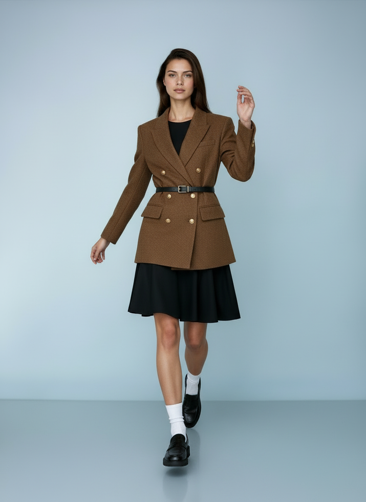 Het dubbelgeknoopte ontwerp en de elegante structuur maken dit een perfecte keuze voor werk, diner of casual chic outfits.