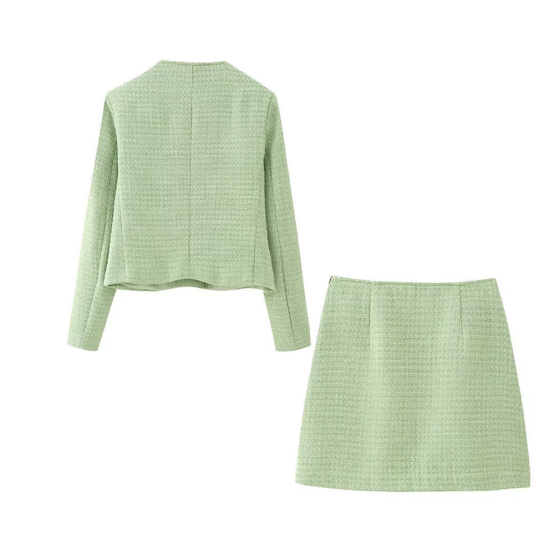 Deze set combineert een strakke silhouet met een zachte, gestructureerde stof. Het korte jasje sluit elegant aan en de minirok accentueert het figuur. De fijne textuur van de stof geeft een subtiele, luxe uitstraling.